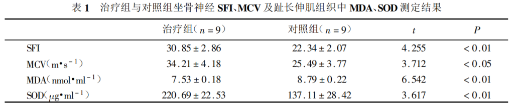 李皓桓等通过动物实验研究,在动物于术后 3周测定坐骨神经功能指数(SFI)、运动神经传导速度(MCV)及趾长伸肌丙二醛(MDA)和超氧化物歧化酶(SOD)的含量,由于对照组,吡咯喹啉醌二钠盐PQQ能有效促进坐骨神经功能恢复。