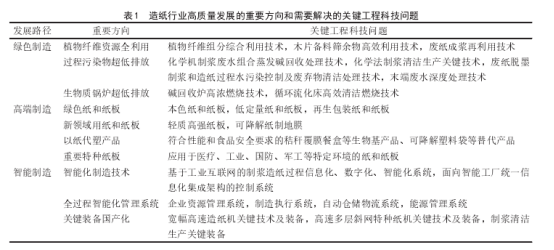 为了实现上述发展目标,造纸行业需要解决的关键工程科技问题如表1所示。