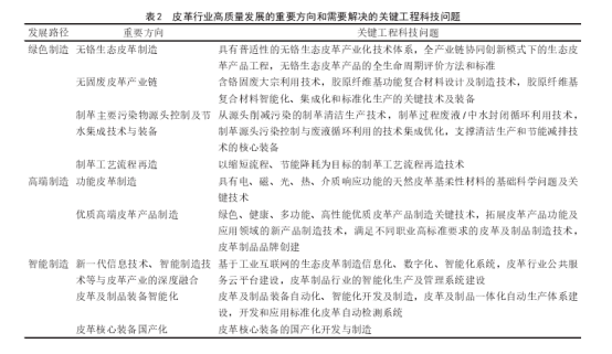为了实现这些发展目标,皮革行业需要解决的关键工程科技问题如表2所示。