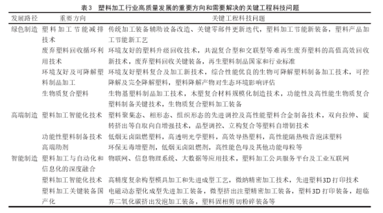 塑料制品的应用行业广泛,而建材、电子、家电、汽车等塑料制品需求侧对新技术产品的信息反馈不足,沟通不畅,使塑料加工产业链整体的创新能力整合不够。因此,未来转型升级应紧密结合下游如新能源汽车、消费电子等新兴产业,对塑料制品的潜在应用市场进行前瞻性布局与开发。为实现上述发展目标,塑料加工行业需要解决的关键工程科技问题如表3所示。
