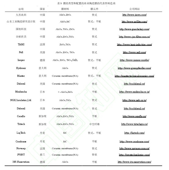 尽管陶瓷膜早在 20 世纪 40 年代就被开发出来,但陶瓷膜分离技术工艺在国内的市场普及率相对于聚合物膜总体较低,许多研究工作也致力于将陶瓷膜的使用扩展到新的应用领域,特别是在那些目前被聚合物膜“占领”的市场。美国、德国、日本和法国等国家的陶瓷膜技术长期占据我国市场主导地位,我国陶瓷膜行业起步较晚,但发展势头迅猛,近年来,我国陶瓷膜产品质量不断提升,行业国产化进程不断加快。国内以南京工业大学的徐南平院士团队为代表率先进行陶瓷膜的研究,并创立了久吾高科,已成功应用于废水处理、市政用水、抗生素分离纯化、油水分离等领域[25]。近年来,在国家政策支持以及本土企业技术创新等积极因素推动下,我国陶瓷膜国产化进程不断加快[26]。表5列出了国内外部分主要商业陶瓷制造商。