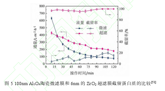 陶瓷膜技术不仅可以完成细胞、悬浊液和大分子等的脱除,而且近年来可实现目标产品的预浓缩,已成功应用于大宗发酵产品(有机酸、氨基酸、维生素等)。有机酸,如琥珀酸、丁酸、乙酸和富马酸等广泛应用于食品、药品、化妆品、洗涤剂、聚合物和纺织工业中等领域[49]。近年来,由于日益增长的环境问题和对绿色技术的关注,生物生产途径各种高价值的有机酸得到了极大的关注[50]。这些发酵液中的有机酸一般需要四个主要步骤进行分离纯化:微生物细胞去除,浓缩和澄清(蛋白大分子去除),有机酸的分离和浓缩,纯化和最终晶体形成。微滤和超滤已被有效地用于前两个步骤,通过纳滤可以从氨基酸、色素中选择性的分离出有机酸。Nie 等[51]比较了国产的 100nm 的 Al₂O₃陶瓷微滤膜与 6nm 的 Zr O2 超滤膜澄清癸二酸模拟发酵液,图 5 明显可见超滤膜比微滤膜不仅具有更高的蛋白截留率,而且达到两倍的通量。产生该现象的原因在于超滤膜更小的孔径产生可逆污染。因此,合适孔径的选择能提供膜的抗污性能和维持优越的通量,并且有助于发酵液中目标产物的分离纯化和浓缩。