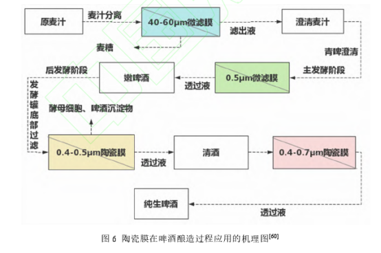 陶瓷膜在发酵食品饮料领域具有广泛的市场。啤酒是一种以小麦芽和大麦芽为主要原料,并加啤酒花,经过液态糊化和糖化,再经过液态发酵酿制而成的酒精饮料。啤酒工业实际应用过程中,料液的过滤温度为 0℃和清洗的温度为 80℃,这广泛变化的温度使得有机膜产生不可预测和不稳定的通量。因此,陶瓷膜虽然需要更高的投资,但是成为啤酒工业唯一的膜选择。Bucher Filtrox 报告了德国和巴西两个酿酒厂全面安装的 Bucher Filtrox 过滤系统分离酵母细胞[59]。陶瓷分离可用于啤酒酿造过程的四个不同阶段:发酵前的麦汁分离、青啤澄清、发酵罐底部过滤和包装前的啤酒灭菌[60]。如图 6 所示,发酵前使用 40-60µm 的微滤膜的麦汁分离。青啤澄清一般采用 0.5µm 的微滤陶瓷膜,孔径低于 0.2µm 会影响啤酒的苦味、丰满度和泡沫形成,而高于 0.8µm 不能很好的分离蛋白。在啤酒发酵结束时,发酵容器的底部含有酵母细胞和啤酒的沉淀物。沉淀物中的啤酒可通过 0.4-0.5µm 的陶瓷膜进行回收。最后,选用 0.4-0.7µm 陶瓷膜来替代传统的加热巴斯德杀菌法来给啤酒杀菌,两者成本差异不大,但是陶瓷膜能保留啤酒原有的“新鲜度”。陶瓷膜技术在啤酒酿造过程中的应用,减少了啤酒的损失、提高了啤酒的质量以及降低了操作的成本[61]。