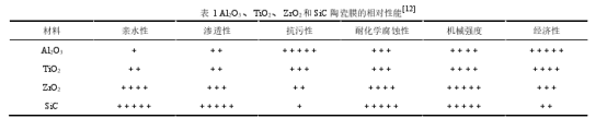 膜分离技术,是在某种推动力作用下,通过两相之间的一个具有选择透过性的薄层屏障,可以在离子或分子范围内进行分离,从而使流体达到分离、浓缩、纯化的目的。根据膜的材料不同,膜主要可以分为聚合物膜、无机膜和金属膜[10]。陶瓷膜是一种经特殊工艺制备而形成的无机膜,常采用 Al2O3、Zr O2、Ti O2、Si C、Si O2 以及其组合物等无机陶瓷材料作为原材料[11]。具有较高的热稳定性,突出的机械强度和宽p H范围的耐受性(p H 值  0~14)。然而,不同陶瓷膜材料具有不同的优势,需要根据具体的应用要求进行选择。常见的陶瓷膜材料的相对性能见表 1[12]。如从经济方面考虑,基于国内原材料市场,Al2O3、Zr O2、Ti O2、Si C 的国内原材料价格分别为 250-350,700-1000,900-1500,1400-2000 美元/吨[13],因此在需求相同的情况下优先考虑成本低的原材料。