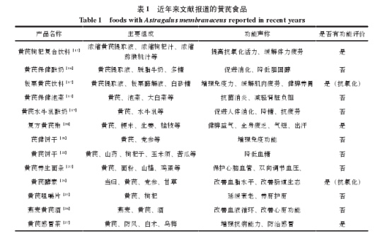 目前,对黄芪的加工和利用主要集中在医药领域,主要针对药物活性成分的提取和药理作用进行研究。由于黄芪在 2020 年才获批为药食两用资源,因此目前市场上销售的黄芪普通食品较少,更多的是应用于医疗保健或者药物。近年来,以黄芪为原料的复合功能性饮料、饼干、酸奶等普通食品的研究报道也逐渐增多。本文对黄芪的生物活性成分、在食品中的应用研究进行综述,为进一步开发与利用黄芪资源提供参考和依据。